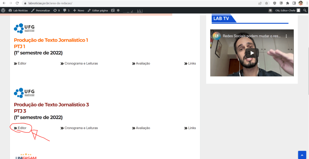 Depois, procure pela opção “Editor” no menu da disciplina de PTJ3: