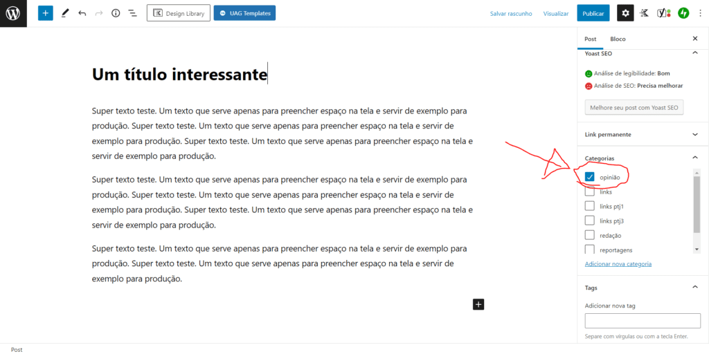 Quando terminar de redigir o seu texto, você precisa marcá-lo com a categoria “opinião”, no menu do lado direito da tela, na aba “Post”, opção “Categorias”.