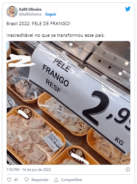 Mas como no Brasil pode-se assegurar alimentação de qualidade, se em um supermercado em Vila Velha, no Espírito Santo, há alguns meses, uma bandeja com pele de frango estava à venda por R $2,99 o quilo. Sim, à venda! Esse fato provocou indignação e repercutiu na internet, mas não sejamos hipócritas: quem está passando fome, não vai deixar de consumir.
