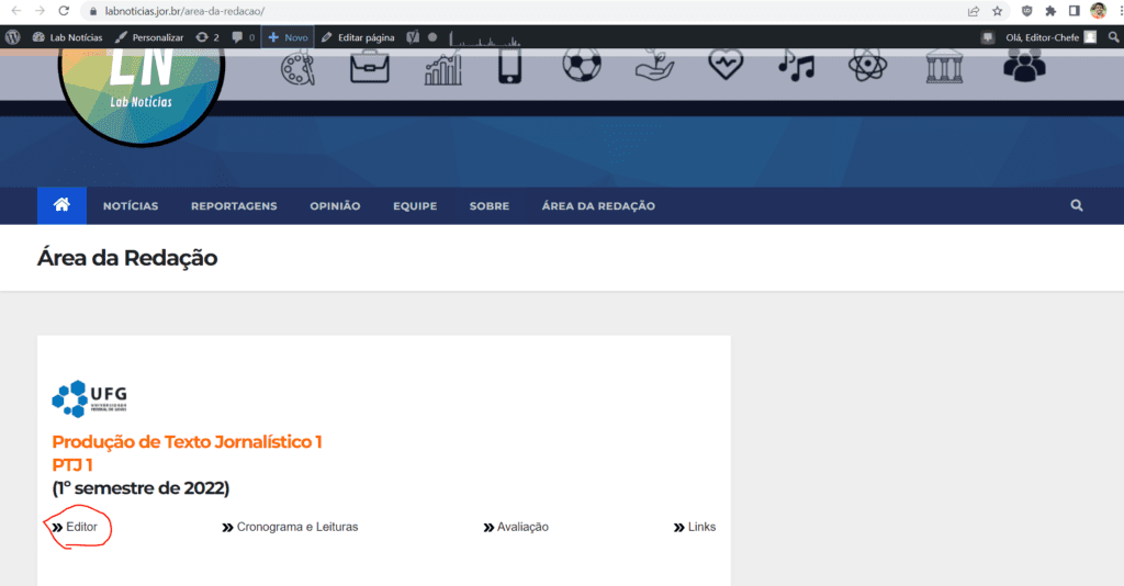 Caso você não seja direcionado para o Painel de administração logo após fazer o login no WordPress, vá até o site do Lab Notícias e clique em “Área da Redação”: