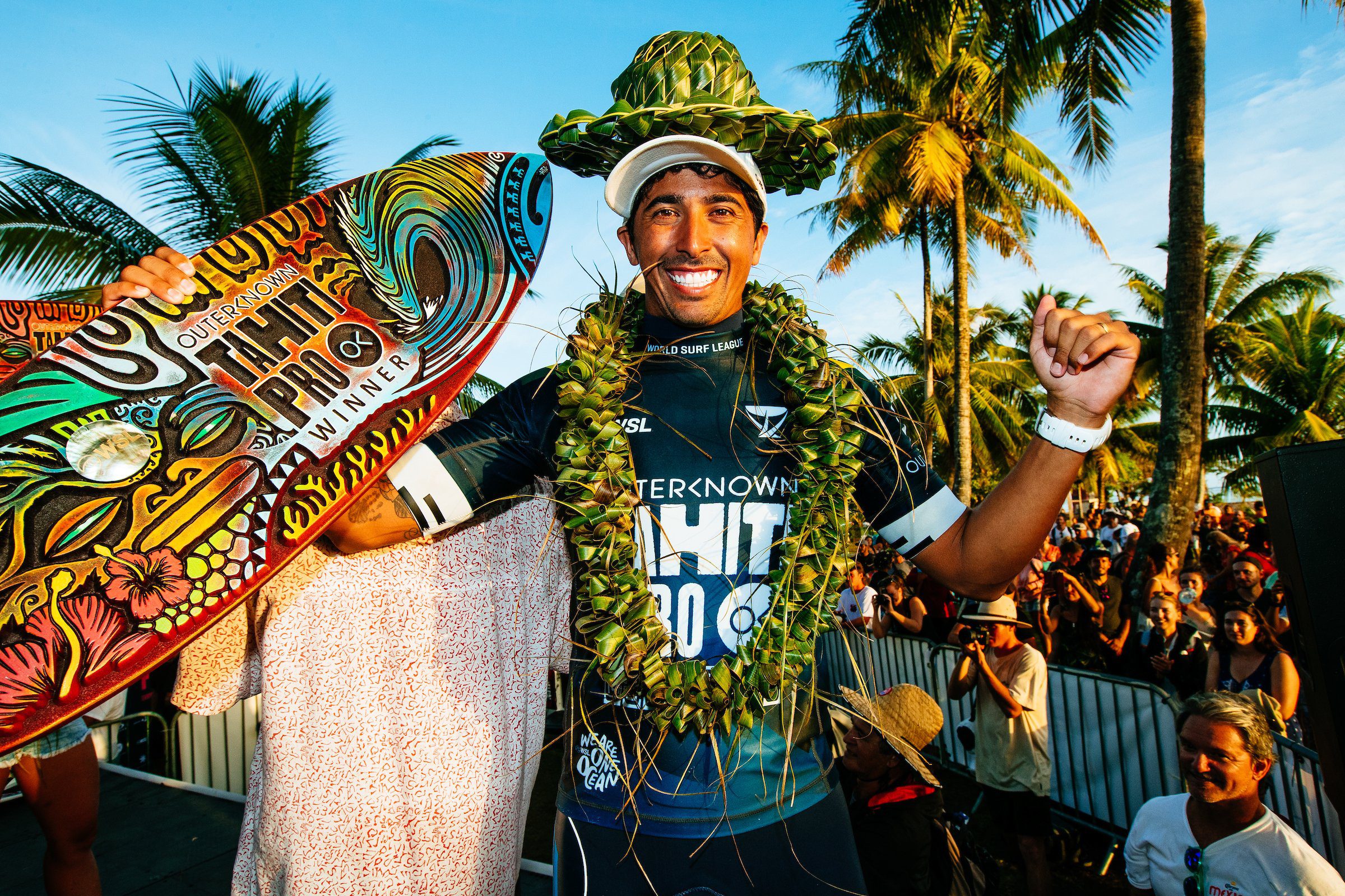 Miguel Pupo recebe seu primeiro troféu no WCT, como campeão do Outerknown Tahiti Pro. Reprodução: WSL Brasil no Twitter.