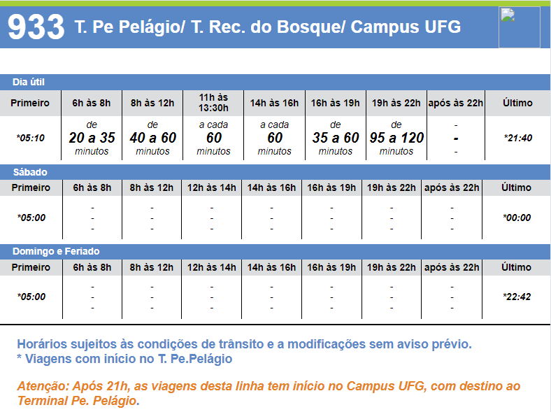 A linha 933, única em sentido ao Terminal Recanto do Bosque e Terminal Pe. Pelágio, durante a noite apresenta o maior período de espera entre os ônibus, podendo fazer os usuários esperar até 120 minutos entre eles. Ana Julya, estudante de museologia e usuária da linha, comenta que, apesar de poder pegar outras linhas, a 933 é a melhor pois a deixa mais cedo em casa e não precisa pegar o eixo – como teria que fazer se usasse outra linha.