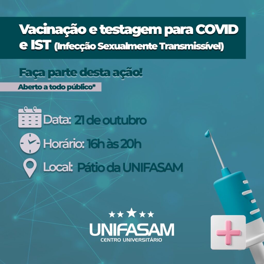 A Unifasam (Centro Universitário Fasam) realizará nos dia 20, 21 e 22 de outubro um evento organizado pelos discentes de enfermagem. A proposta é convidar toda a comunidade a atualizar o cartão de vacinação e promover a testagem da Covid-19 e doenças sexualmente transmissíveis. O evento também conta com palestras que integram o curso de enfermagem e a importância da discussão sobre saúde pública e coletiva.