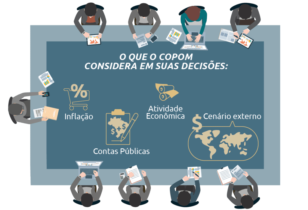 Quem decide esses valores da taxa de Juros é o Copom, e ele se reúne a cada 45 dias para definir se a taxa Selic aumenta, diminui ou se mantém estável.