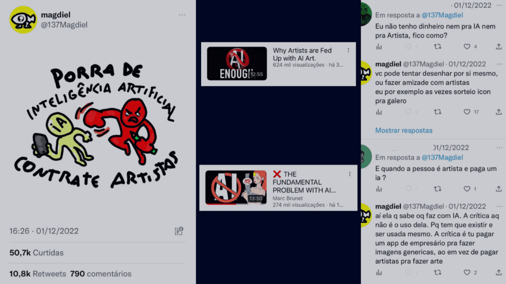 Por outro lado, o designer gráfico, Erick Almeida, defende: “Acredito que tenha seus pontos positivos, mas da forma que está hoje em dia, e da forma que eles pretendem deixar no futuro, prejudicará muito nosso trabalho.Hoje em dia a IA ainda não tem capacidade de fazer artes perfeitas, mas ainda estamos no início de tudo isso. O que me preocupa é pensar onde isso vai parar. A cada dia que passa as ferramentas estão melhorando e alguns clientes já não vem mais necessidade de contratar artistas.”
