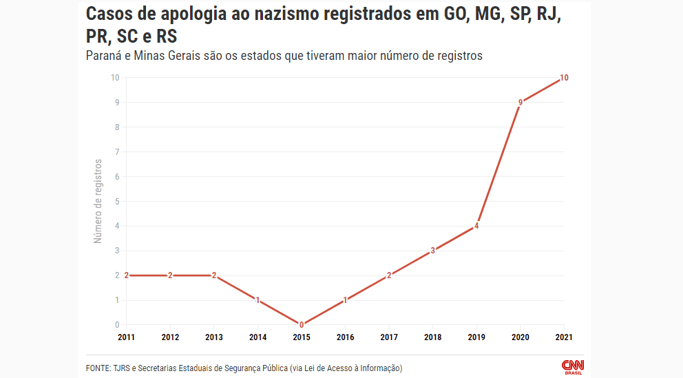Atualmente, o crescente número de células que tentam perpetuar esse ideal criminoso tem crescido exponencialmente. No Brasil, de acordo com dados da CNN Brasil, em 2021 houve o crescimento em 900% de denúncias relacionadas ao nazismo.