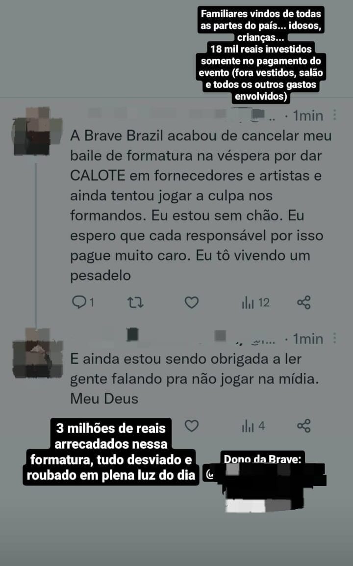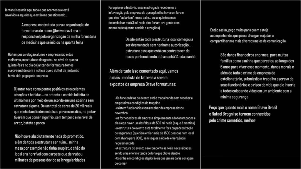 Em Nota Pública de Esclarecimento, a empresa alega “fornecedores e prestadores de serviços, passaram a destratar e/ou modificar as condições de pagamento das prestações de serviços já contratadas, alterando todo o fluxo anteriormente definidos;”, informa um suposto saldo devedor de 530 mil reais e, por isso, afim de realizar o Baile de Formatura, solicita “Contrapartida de cada Formando (para ajuste no cardápio a ser executado pelo pessoal da Brave): Integralização de R$ 2.500,00, até as 17 horas de hoje (via pix a ser informado);”, considerando que a reunião, segundo o próprio documento, havia ocorrido às 13 horas.