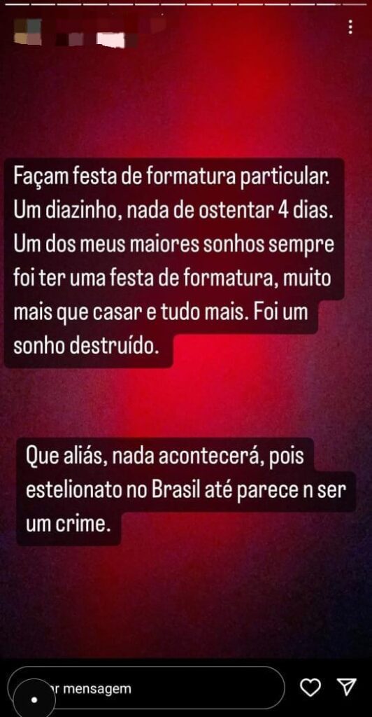 No entanto, a decisão do baile surgiu essa madrugada, quando eles nos enviaram um comunicado dizendo” não aconteceu nada” então, já existia certa desconfiança, mas que era naquela crença de “está sendo resolvido, vamos confiar, vai dar tudo certo, tem outras festas que já foram feitos por eles que deram certo”. Falaram até pra gente, inclusive, que eles já atrasaram o pagamento, mas eles pagam e dá certo, “podem até pagar no dia, mas eles pagam”. A gente não teve essa sorte e culminou em tudo isso que nos aconteceu hoje.