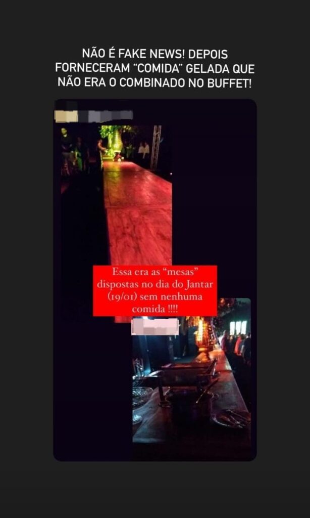 Sobre o que foi entregue, foi satisfatória a parte da missa, colação de grau, foram satisfatórias essas partes que não envolvem fornecedores externos da empresa, nem pagamentos externos para sua realização, o jantar foi satisfatório, as atrações foram satisfatórias, o bar de bebidas, isso foi perfeitamente satisfatório, não tem que reclamar. A parte de organização foi péssima, e pior ainda foi a parte do jantar porque o fornecedor não recebeu a parcela do jantar, então os convidados praticamente não tiveram comida de um cardápio imenso que teria para várias horas de festa simplesmente não teve nem sequer 3% do que tinha sido acordado.