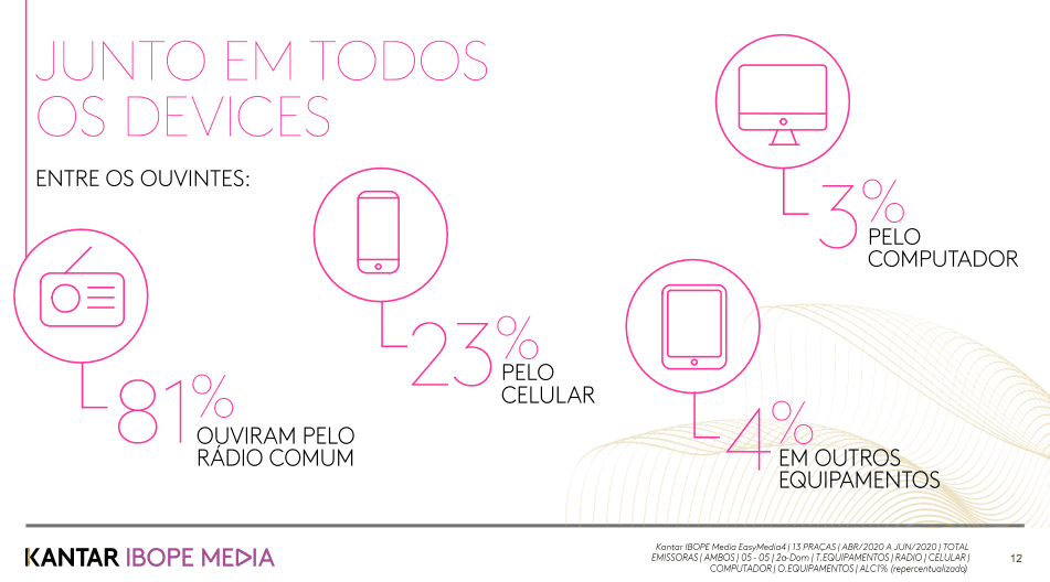 O site oficial da ABERT afirma que, na época do lançamento, menos de mil emissoras possuíam aplicativos exclusivos. Três anos depois, em 2018, já eram quase 5 mil. Assim, a possibilidade de acompanhar rádio de forma online já era oferecida por muitos mas, após a pandemia de Covid-19, se tornou imprescindível. De acordo com levantamento da Kantar IBOPE Media, 75% dos ouvintes de rádio mantiveram a frequência na pandemia, e 17% passaram a ouvir mais rádio. Além disso, a mesma pesquisa revelou que quase 80% dos ouvintes de rádio executam a prática de dentro de suas casas e 23% escutam os programas através de seus celulares.