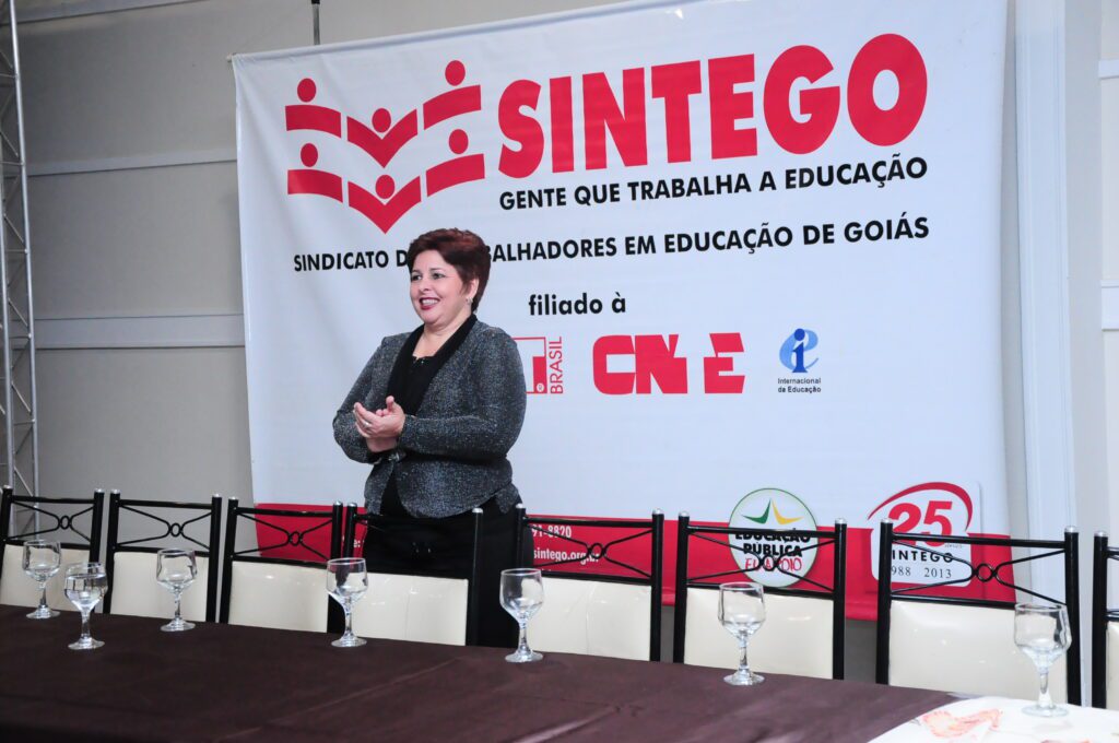 A presidente do Sintego falou muito sobre a luta intensa do sindicato para que seja respeitada a lei do piso; destacou que não vêm tendo apoio do governantes de Goiás; realçou a importância da eleição de Lula como presidente do Brasil; falou sobre o novo ministro da Educação; além de destacar suas pautas e pensamentos para o sistema educacional goiano e brasileiro.
