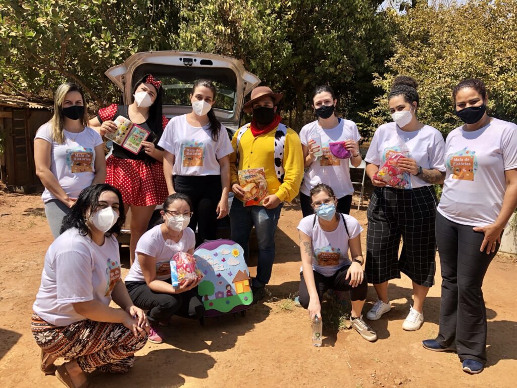 Assim resolvi fazer uma ação da Mala de Histórias e começamos em 2019. Chamei uns amigos e fomos levar livros e lanches para crianças de uma comunidade em vulnerabilidade social. Eu não sabia o que era uma organização social, não fui com o propósito de criar uma ONG, mas depois que a gente começa nisso aí não dá para sair. Toma uma proporção grande e a gente vê o quanto é gratificante ficar com as crianças. Quando se tem acesso a uma realidade diferente da nossa e se vê que esse acesso à cultura e à arte é para uma parcela pouca da população – ninguém consegue curtir arte passando fome – a gente acaba tomada por essas discussões e querendo migrar para isso. A ONG foi crescendo nesse sentido. Hoje somos três diretoras responsáveis legais pela ONG e eu estou à frente da parte mais criativa. A parte organizacional fica com minhas duas amigas, que são engenheiras. Já estamos indo para o quarto ano da Mala de Histórias e foi lindo.