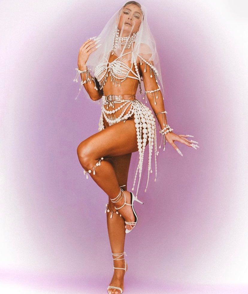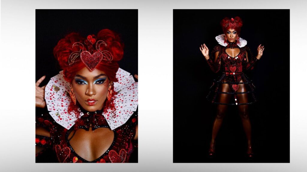 Erika Januza, feita por encomenda e ela solicitou que eu fizesse a fantasia! As artistas geralmente gostam de fazer parceria, mas não foi nesse caso. Foi muito gratificante, me deixou muito satisfeito com o resultado. É uma roupa muito conceitual, muito fashion!, responde o estilista sobre seu trabalho recente