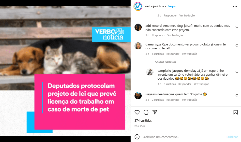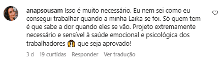 “Mediante a perda [do animal], o tutor fica abalado. Nessa fase do luto é muito importante respeitar o momento, e esse afastamento [do trabalho, proposto pelo projeto de lei] é essencial para o processo de cura. Devemos respeitar todos os tipos de dores”, comenta ela.