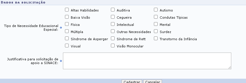Após clicar em “outros”, selecionar “Necessidades Educacionais Especiais” e, em seguida, “Solicitar apoio à SINACE”.