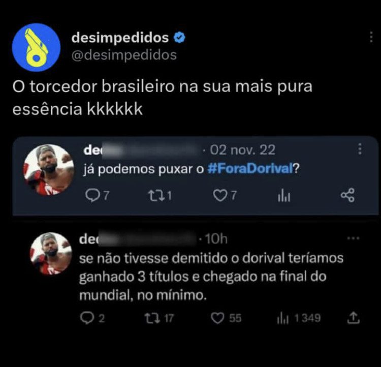 Como mostra uma mensagem no Twitter feita por um torcedor do Flamengo, que descreve sua insatisfação com Dorival Júnior, até então técnico do time, pedindo pela sua saída. Tudo isso porque uma temporada com 43 vitórias, uma Copa do Brasil e uma Libertadores não foram o suficiente para conquistar o torcedor.