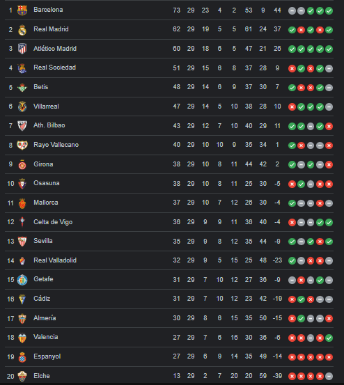 O Real Madrid vem logo atrás com 62 pontos, puxando junto o Atleti e a Real Sociedad, que fecham o G4, ocupando as 4 vagas destinadas à Champions. Na zona de classificação para a Europa League, Real Bétis e Villareal dominaram as vagas, e alternam entre 5º e 6º lugar, sem abrir espaços para quem vem atrás.