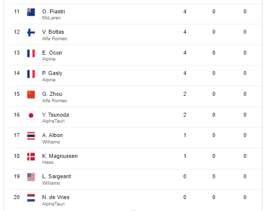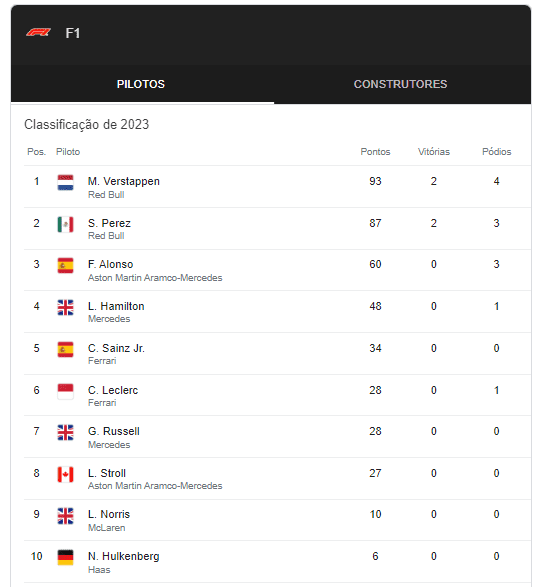 A vitória de Sergio Pérez possibilitou ao piloto diminuir a vantagem para o bicampeão de Fórmula 1 e atual líder do Campeonato de 2023, Max Verstappen. O mexicano ocupa a segunda colocação na tabela, apenas seis pontos atrás do companheiro de equipe. Confira tabela de classificação na integra.