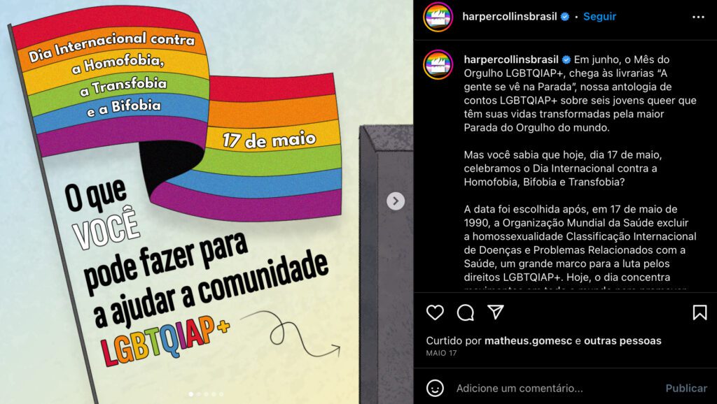 Além de entregar um livro que possui representatividade LGBTQIAP+ e selecionar autores que fazem parte da própria comunidade para contarem essas histórias, a editora decidiu organizar uma série de posts no seu Instagram (@harpercollinsbrasil) promovendo o livro e informando o público geral da importância e relevância desse tipo de enredo para a atualidade.