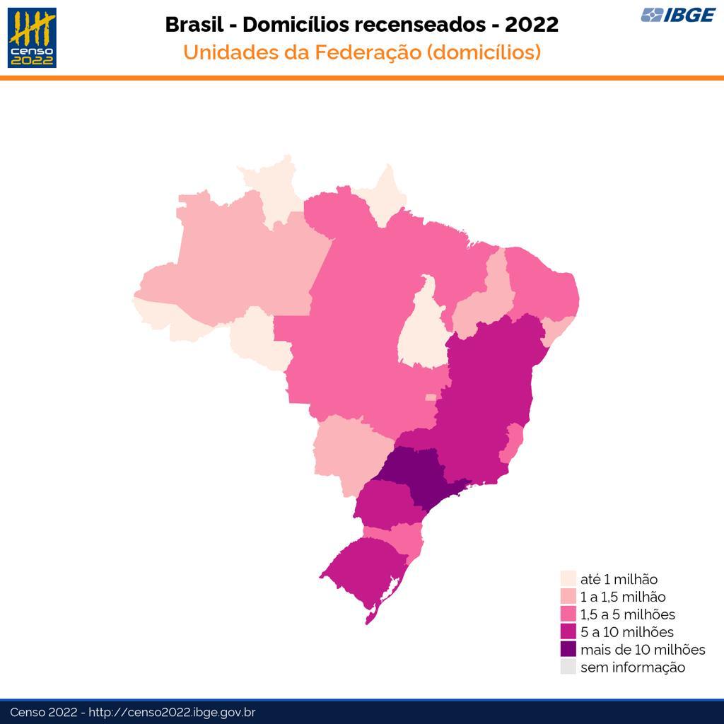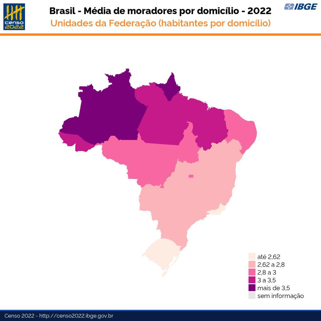 Observando o mapa do Censo no que diz respeito à quantidade de domicílios por unidade da federação, os estados da Região Sudeste são os que mais possuem domicílios – mais de 38 milhões. Em contrapartida, os estados com menos domicílios são os da Região Norte – aproximadamente 6,5 milhões. Na comparação entre as quantidades de domicílios e a média de moradores por domicílio, os números se invertem: os estados da região norte – em especial o Amazonas – são os que possuem o maior número de pessoas morando em uma mesma residência. É uma média de 3,3 habitantes/domicílio ante os 2,69 da região sudeste.