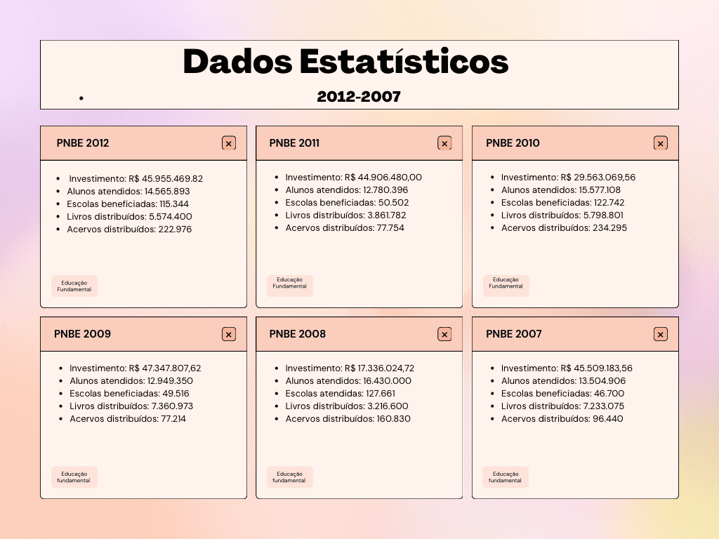 Esses programas governamentais foram criados em 1997 com o objetivo de fornecer livros didáticos de forma regular e gratuita para as escolas públicas. Segue uma tabela informando o investimento, os alunos atendidos, as escolas beneficiadas, os livros e os acervos distribuídos de 2007 até 2012: