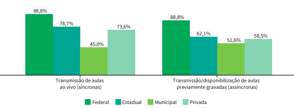 De acordo com o Censo Escolar da Educação Básica de 2022, realizado pelo Instituto Brasileiro de Geografia e Estatística (IBGE), no ensino fundamental cerca de 89,4% das escolas federais, 77% das estaduais, 48,5% das municipais e 72,7% das privadas possuem acesso à internet para ensino e aprendizagem. Já no ensino médio, na rede federal, 92% das escolas usam esse recurso para estes fins, acompanhada de 77,7% das estaduais, 72,2% das municipais e 84,9% das privadas. Conclui-se que, com a pandemia, o acesso à internet cresceu e abrangeu mais pessoas por todo o país, até mesmo em regiões mais afastadas.