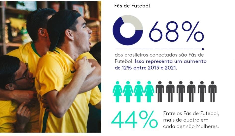 Além disso, o Kantar Ibope mostra que 68% dos brasileiros são fãs de futebol e que as mulheres representam 44% da base de fãs de futebol no país. (COLOCAR CONCLUSÃO?) COM FALA E NÃO DADOS