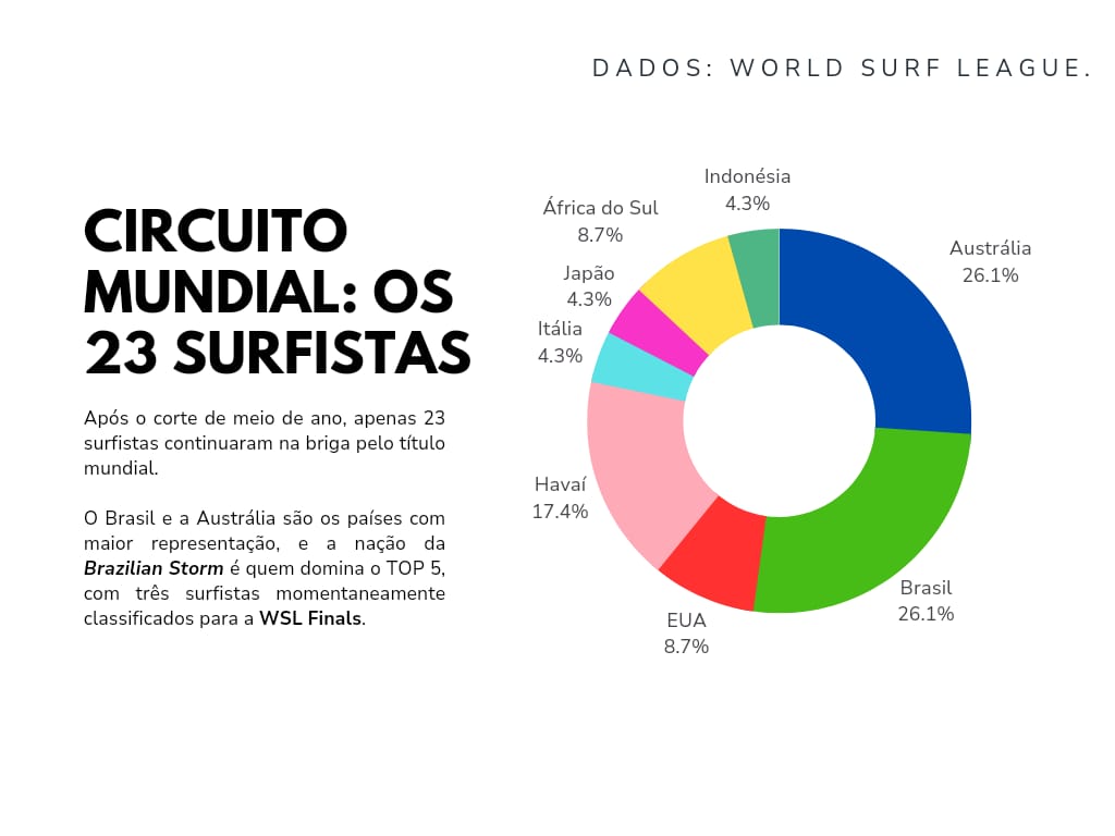 Gráfico indicando porcentagem das nacionalidades dos 23 surfistas que sobreviveram ao corte de meio de ano da WSL. Gráfico: Tayná Freitas.