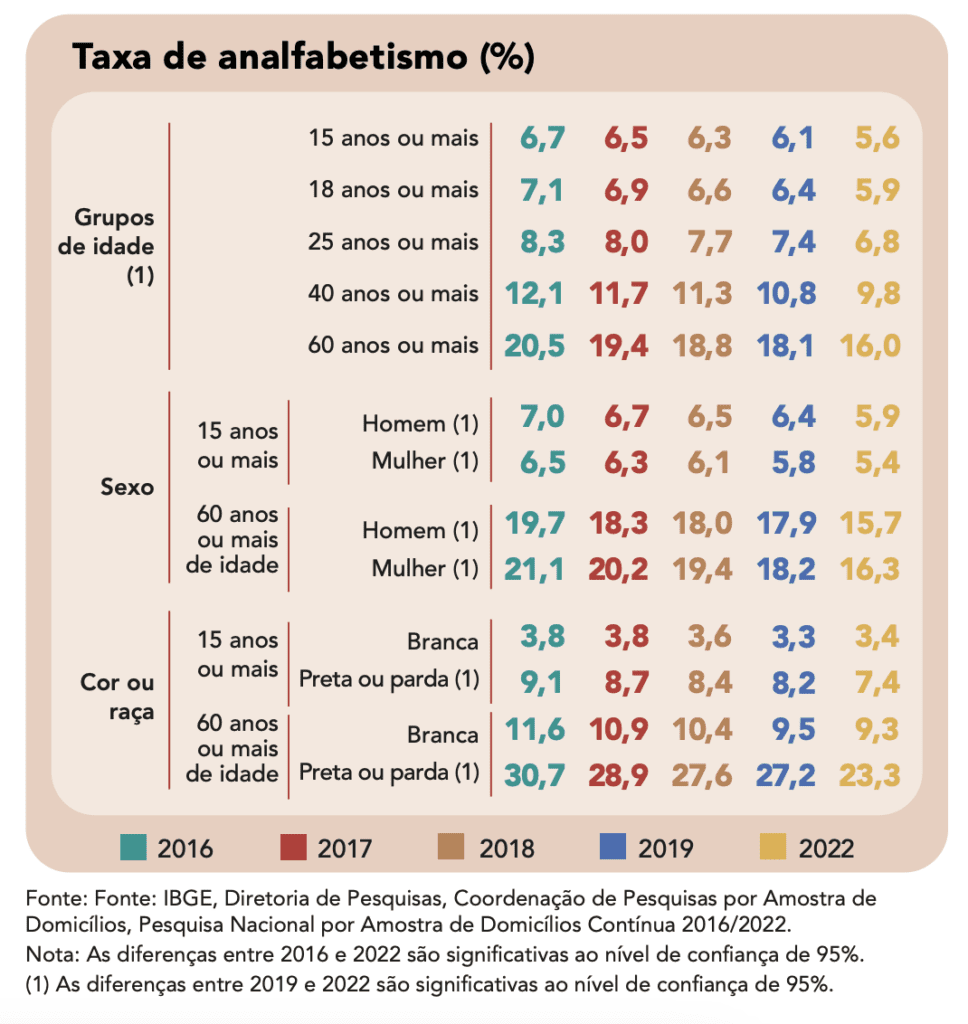 No mais recente levantamento da Pesquisa Nacional por Amostra de Domicílios (PNAD) voltada para a educação, referente ao ano de 2022 e divulgado em 2023, dados indicam avanços significativos no combate ao analfabetismo no Brasil. A taxa de analfabetismo em indivíduos com 15 anos ou mais apresentou uma queda notável, passando de 6,1% para 5,6%.