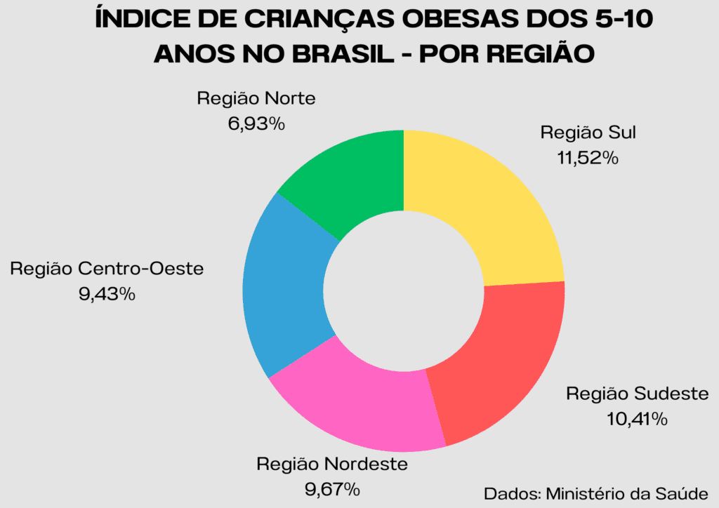 Identificado pela Política Nacional de Alimentação e Nutrição (PNAN) como um problema de saúde pública, a maior taxa obesidade se encontra concentrada na Região Sul do Brasil, com 11,52% das crianças obesas nessa faixa etária. Em contrapartida, é na Região Norte que encontramos os menores índices do país: cerca de 6,93%.