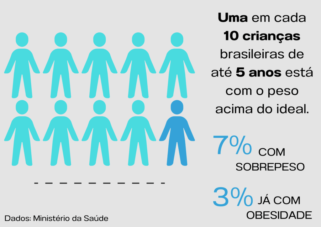Já entre as crianças mais novas, a problemática tende a ser ainda mais recorrente. Em 2019, o Estudo Nacional de Alimentação e Nutrição Infantil (EMANI), em parceria com o Instituto de Nutrição Josué de Castro, da Universidade Federal do Rio de Janeiro (UFRJ), afirmou que 18,6% das crianças abaixo de 5 anos apresentam risco de sobrepeso.