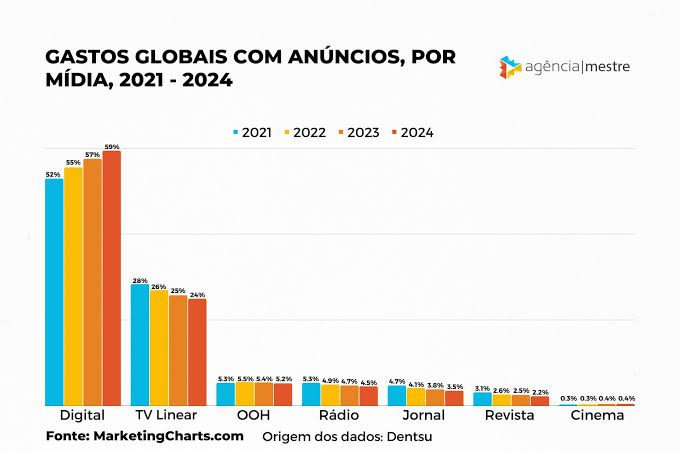 Espera-se que os anúncios digitais sejam responsáveis por 55,5% do total de gastos este ano e cheguem a 59,4% até 2024.