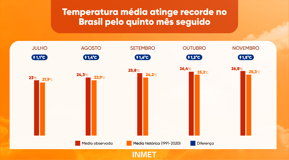 De acordo com o estudo as temperaturas ficaram acima da média histórica nos meses de julho a novembro, como mostra a tabela abaixo: