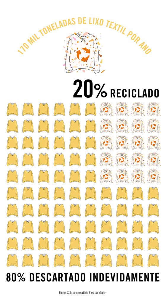 No Brasil, a situação é medida pelo Sebrae (Serviço Brasileiro de Apoio às Micro e Pequenas Empresas), que aponta danos impactantes. Dados coletados no relatório Fios da Moda, mostram que, anualmente, cerca de 170 mil toneladas do lixo brasileiro são de produtos têxteis, ou seja, sobras e descartes de tecido. E deste total, apenas 20% é destinado à reciclagem. Os outros 80% são direcionados para lixões e incineradoras.