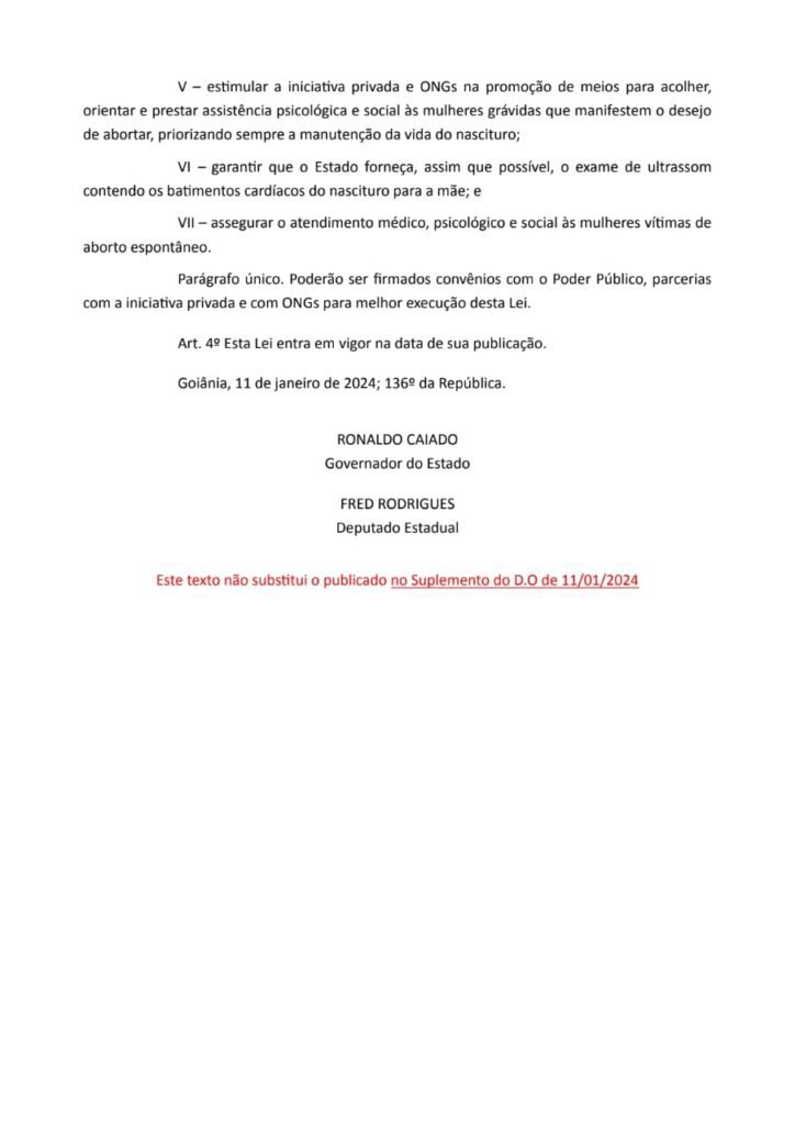 Sua proposta foi redigida pelo ex–deputado estadual Fred Rodrigues (Democracia Cristã) e assinada pelo Govenador do Estado de Goiás, Ronaldo Caiado (União Brasil). Ao contrário do que foi divulgado em inúmeros canais de mídia, a legislação não obriga a gestante a fazer o ultrassom, mas ela foi escrita de forma a gerar dúvidas. Desse modo, deixo para você, leitor, um espelho para que se possa fazer sua interpretação: