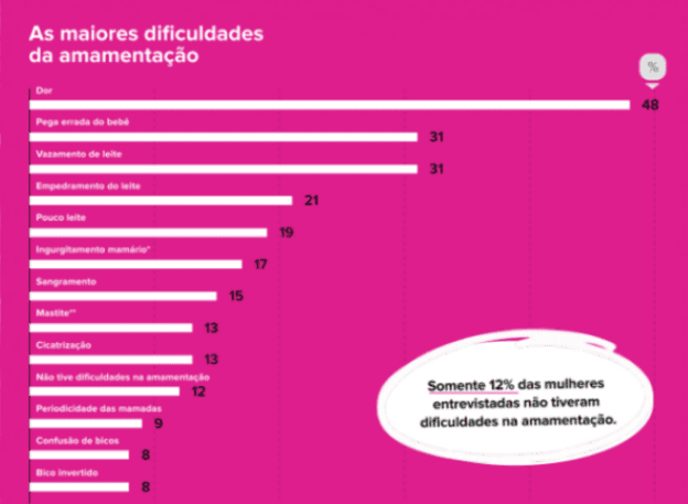 Em um estudo levantado pelo site minha vida, cerca de 1800 mães foram convidadas a participar de uma pesquisa feita pela empresa MindMiners, especialista em pesquisa digital, onde conseguiram analisar que as principais dificuldades enfrentadas pelas mães na hora da amamentação variam entre dor, vazamento do leite e o empedramento do leite. A maioria dessas mães tinham o desejo de amamentar seus filhos, mesmo sentindo falta de informações sobre o aleitamento materno. Somente 12% dessas mulheres relataram não ter enfrentado dificuldades na hora da amamentação. Confira, a seguir, o ranking da pesquisa: