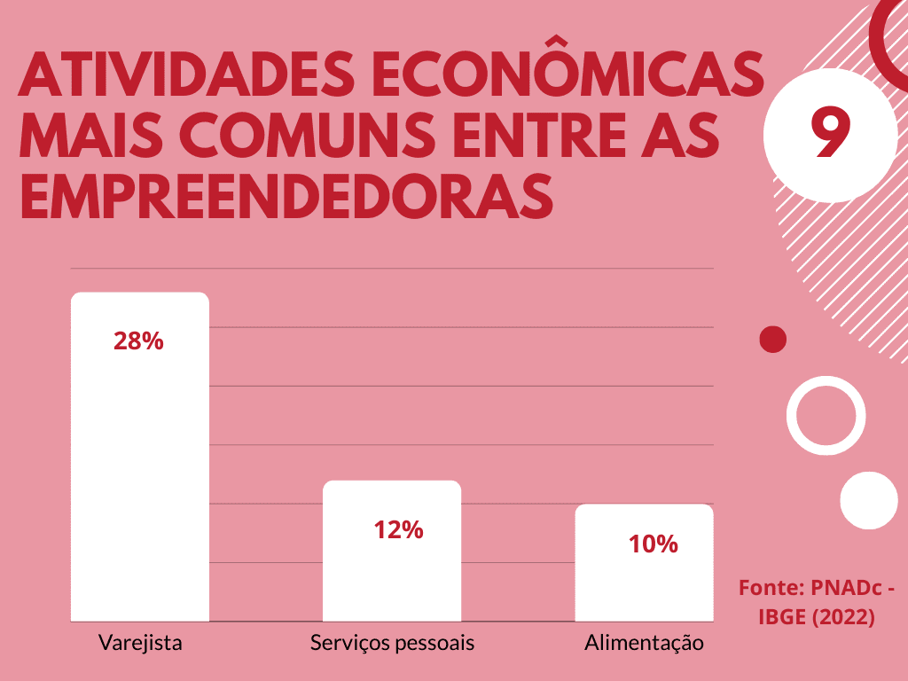Os setores econômicos mais frequentes entre as empresas lideradas por mulheres são o comércio varejista (28%), serviços pessoais diversos (12%) e atividades de alimentação (10%). Quanto ao local de trabalho, quase metade das empreendedoras (49%) possui um estabelecimento próprio, como loja, escritório ou galpão, enquanto 36% trabalham a partir de suas casas e 12% em outros locais.