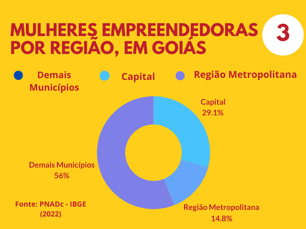 No âmbito geográfico, a cidade de Goiânia desponta como o principal polo onde as mulheres empreendem, concentrando 29% das empreendedoras do estado, seguida pela Região Metropolitana, com 15%. No entanto, ressalta-se que o empreendedorismo por mulheres também se faz presente em municípios menores, contribuindo para o desenvolvimento econômico local, sendo que a maioria (56%) se concentra nos demais municípios.