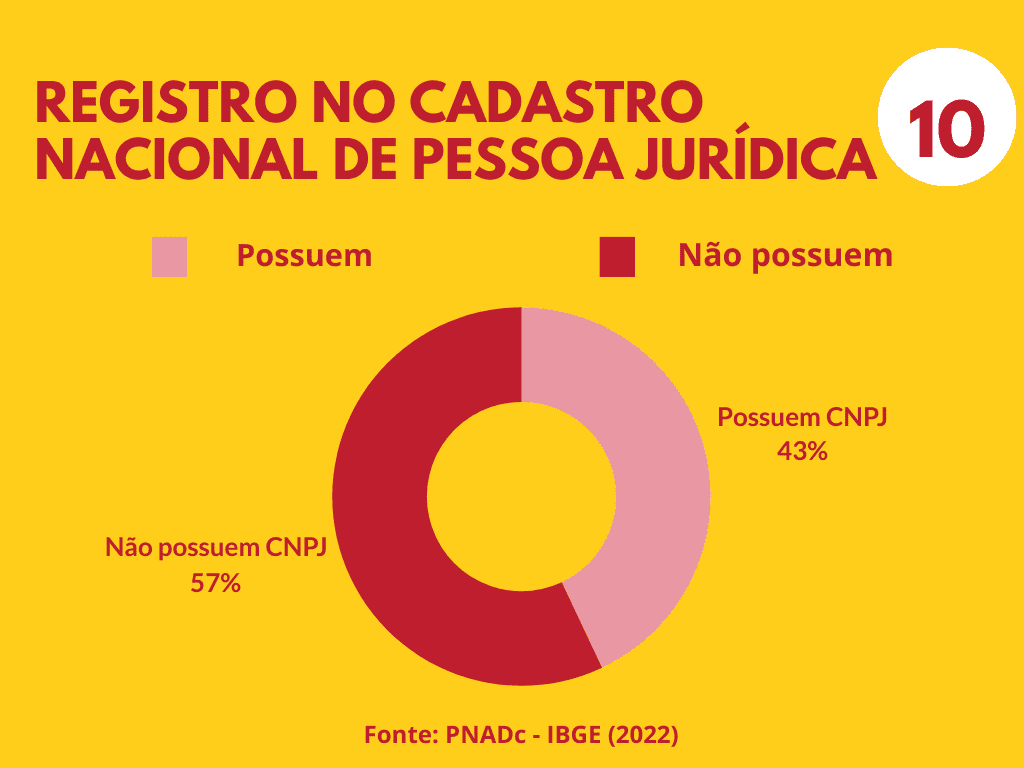 Um aspecto também relevante dentro do empreendedorismo, diz respeito à formalização do negócio. Cerca de 57% das empreendedoras não possuem Cadastro Nacional da Pessoa Jurídica (CNPJ), enquanto 43% estão formalizadas.