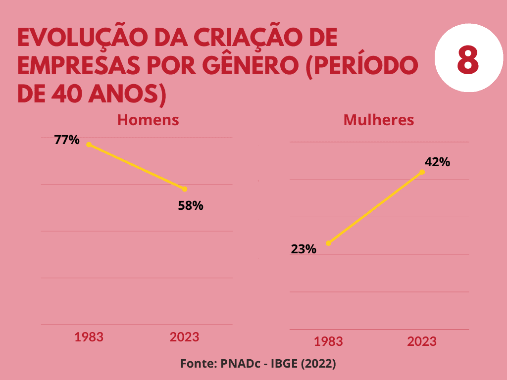 Ao longo dos últimos 40 anos, de 1983 a 2023, houve um crescimento notável na participação de mulheres na constituição de empresas. Em 1983, apenas 23% das empresas eram formadas por mulheres, enquanto 77% tinham homens como sócios. Em 2023, essa proporção mudou para 42% de empresas constituídas por mulheres e 58% por homens, com essa diferença permanecendo estável desde 2013. Além disso, 80% das mulheres empreendedoras atuam sem sócios.
