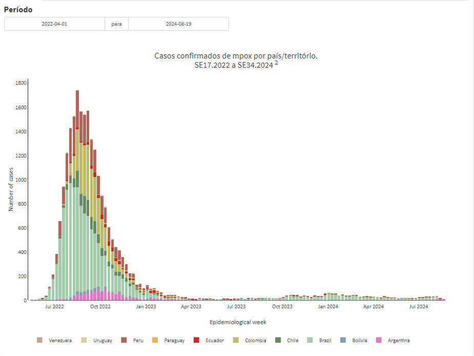 Casos Confirmados de mpox na América do Sul entre abril de 2022 e agosto de 2024: