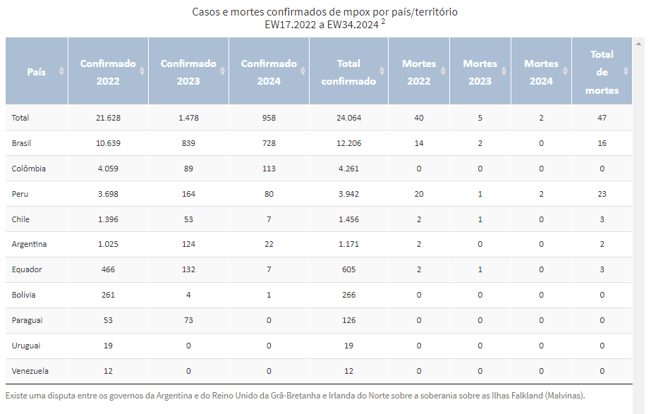 O boletim mais recente do Ministério da Saúde, divulgado em 27 de agosto deste ano, informa que nenhuma morte por mpox foi registrada este ano no Brasil.