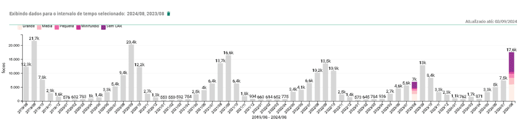 Segundo o Programa Queimadas, do Instituto Nacional de Pesquisas Espaciais (INPE), em agosto de 2024, houve um aumento de 146% de focos de incêndio em propriedades rurais, em relação ao mesmo período no ano anterior.