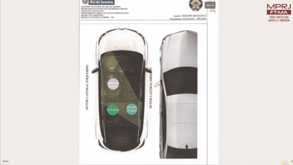 Laudo de perícia do alcance dos disparos, com a posição de cada ocupante (Marielle – azul, Fernanda – verde, Anderson – lilás). Imagem: MP-RJ.