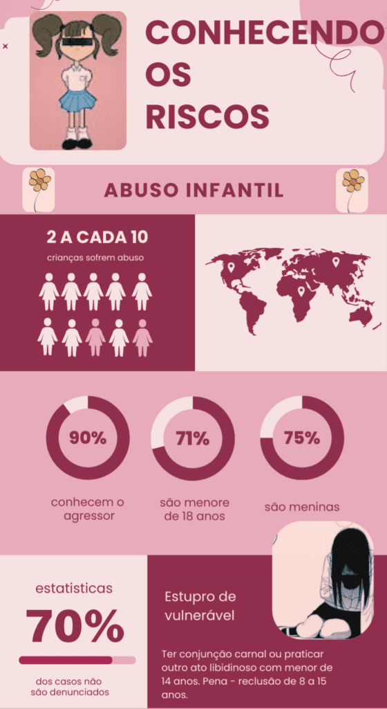 Além disso, um boletim epidemiológico do Ministério da Saúde, revela que, entre 2015 e 2021, foram notificados 202.948 casos de violência sexual contra crianças e adolescentes no Brasil, o que corresponde a quase 80 casos por dia.