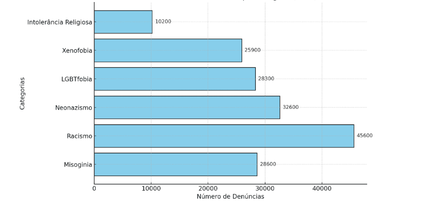 A misoginia, um dos tipos de crime de ódio que mais cresce, envolve ataques e agressões virtuais contra as mulheres. Em 2022, foram registradas 28,6 mil denúncias desse tipo de violência, um aumento de quase 30 vezes em relação a 2017, quando o número foi de apenas 961. Além disso, foram registrados 45,6 mil casos de racismo, 32,6 mil de neonazismo, 28,3 mil de LGBTfobia, 25,9 mil de xenofobia e 10,2 mil de intolerância religiosa.