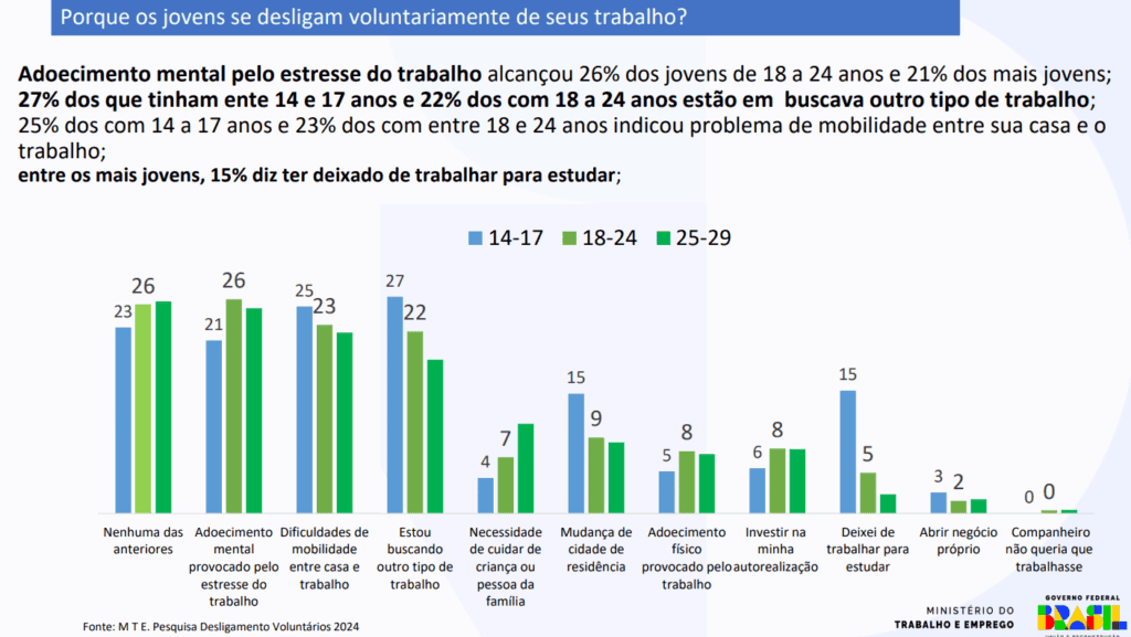 Citada a questão da exaustão, segundo o MTE (Ministério do Trabalho e Emprego), em uma pesquisa que investiga o desligamento voluntário de trabalhadores, referente ao ano de 2024, o adoecimento mental pelo estresse do trabalho alcançou 26% dos jovens de 18 a 24 anos que se demitiram nesse ano.