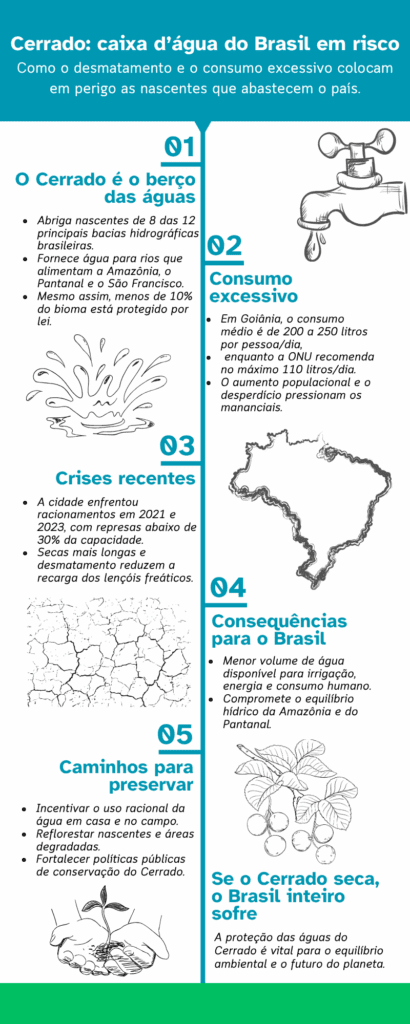 • ODS 6 (água potável e saneamento): a conservação do Cerrado ajuda a proteger bacias hidrográficas e garantir recursos hídricos.