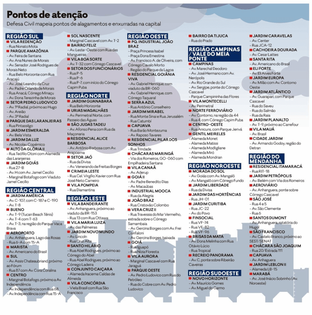 O momento vigente é de uma cidade que sofre cada vez mais com as chuvas. De acordo com a Defesa Civil de Goiânia, os pontos de alagamento mais que dobraram nos últimos dez anos. Em 2015 haviam 57 pontos e neste ano chegaram a 135, sendo 10 deles críticos: Marginal Botafogo (Jardim Goiás e Centro), Vila Redenção, Parque Amazônia, Pedro Ludovico, Setor Sul, Parque Industrial João Braz, Residencial Goiânia Viva e no Finsocial (Rua VF-82 e VF-96).